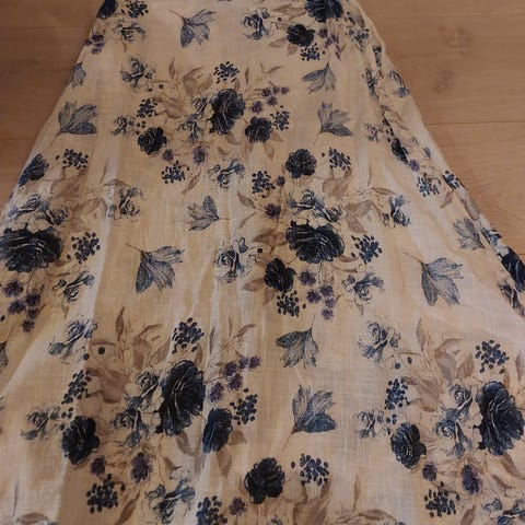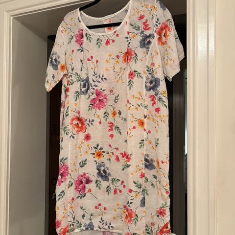 Pent brukt kjole fra Isolde i myk, lett linblanding. Ermeløs modell i blå/grå tone med knapper foran og praktiske lommer med knyting på sidene. Luftig og behagelig passform, perfekt til sommer, ferie eller late dager der man later som man har kontroll på livet.