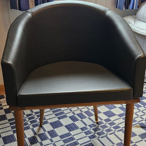 Stolens rygg og sete er trukket i svart skinn, og den har ben i teak.