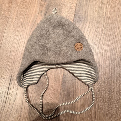 Selger en lue fra Nøstebarn str 52. Dette tilsvarer ca 9-18 mnd. Luen er i ull med vindbeskyttende mellomlag ved ørene og ullfleece ytterst.