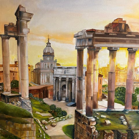 Selger en gammel og flott oljemaleri "Streetscene" fra N. Ninetti, Italia.