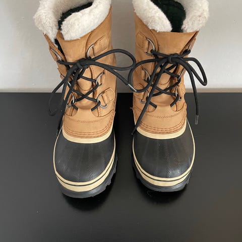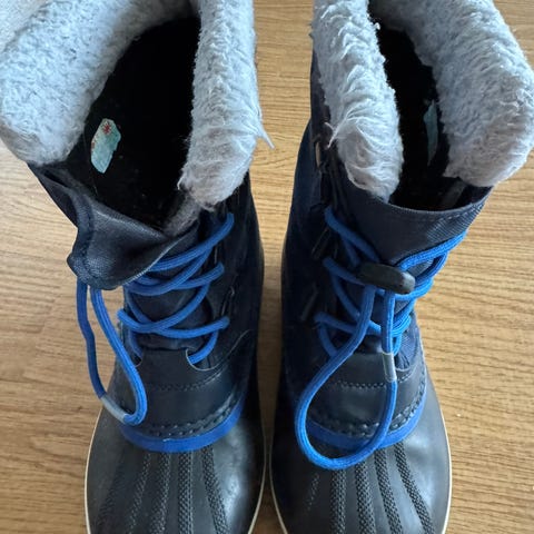 Skoene har en blå overdel med snøring og en svart gummisåle. Innvendig er de foret med mykt, hvitt fleecefôr som gir varme og komfort.