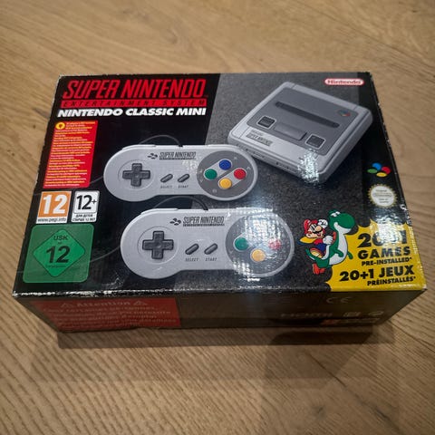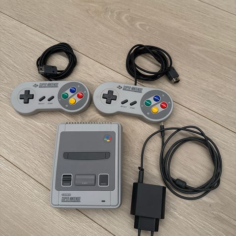 Mini snes Nintendo Super Nintendo spillkonsoll med to kontroller. Konsollen er i grå farge og har tilkoblinger for to kontroller. Kontrollerne har standard layout med fargede knapper.