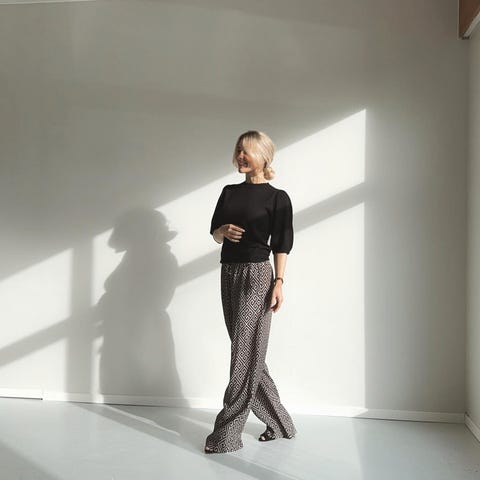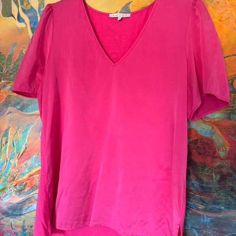 Sort bluse i 100% silke fra Amuse by Veslemøy. Blusen er litt innsvinget (se mål under) og har folder rundt skuldrene som gir en vakker, nesten litt skulpturell silhuett. Lange, smale ermer med splitt nederst ved håndleddet. Lukkes med knapp i nakken.