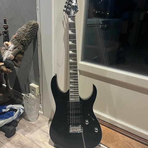 Selger en Ibanez RGR320EX el-gitar i svart. RG-serie, Floyd Rose-type tremolo (Edge III) og EMG Designed humbuckere. Passer godt til rock og metal.