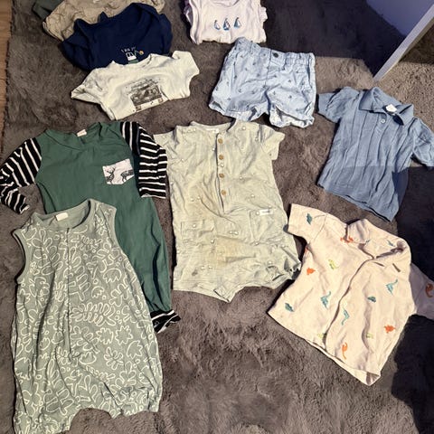Veldig lite brukte klær. 1 joggesett, 1 heldress, 7 gensere, 3 skjorter, 10 bodyer, 1 god og varm ullbukse og 3 bukser.