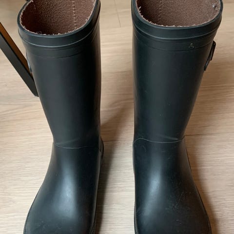 Bisgaard gummistøvler for barn, unisex, størrelse 33. og 31. Støvlene er blå med mønster og har snøring øverst for justering. Egnet for bruk i vått vær og gjørmete forhold.