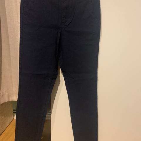 Lindex Holly & Whyte bukse i marineblå farge, størrelse 42 for dame. Laget av bomullsmateriale. Buksen har glidelåsdetaljer og klassisk design.