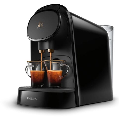 Philips L'OR Barista kaffemaskin i svart farge. Maskinen er liten og designet for å lage kaffe med L'OR kapsler. Den har et kompakt design og inkluderer en avtagbar vannbeholder, melkeskummer og dryppbrett. . Passer for hjemmebruk.
