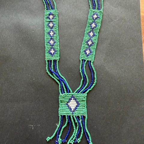 Unik Afrikansk Zulu håndlaget glassperle hårbånd pynt. Ikke brukt, som ny, uten skader. Bredde ca 3 cm, lengde ca 41 cm. Perlene er kraftige (dvs ikke små) hvit, gul, blå, rød, grønn, sort farget. Nydelig håndarbeid. Se bilder for nærmere beskrivelse. Kan hentes Nydalen i Oslo etter avtale Vipps oppgjør ellers sendes Fiksferdig i posten.