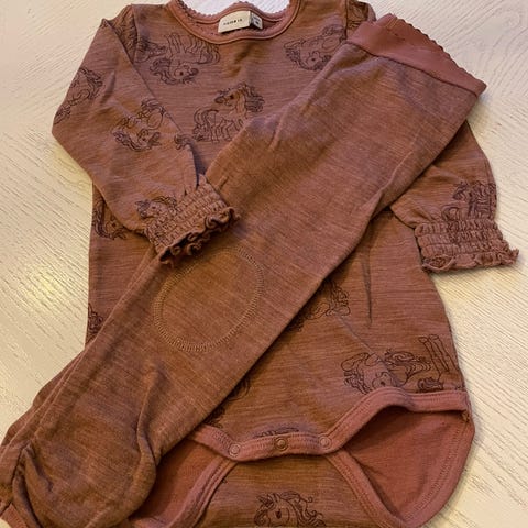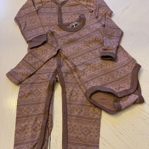 1 body med 2 matchende bukser, str 86. Merinoull. Selges samlet kr 400.