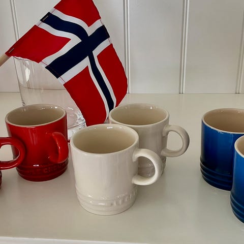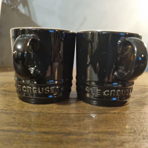 Le Creuset Old Stone espresso krus i størrelse 0,1l, i fargene rød og blå. Laget i steintøy.