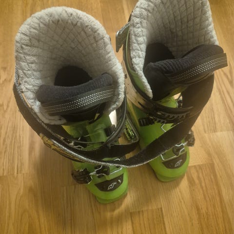 Nordica skistøvler i sølvfarge med røde spenner. Støvlene har flere spenner for justering og en solid såle med god festeevne.