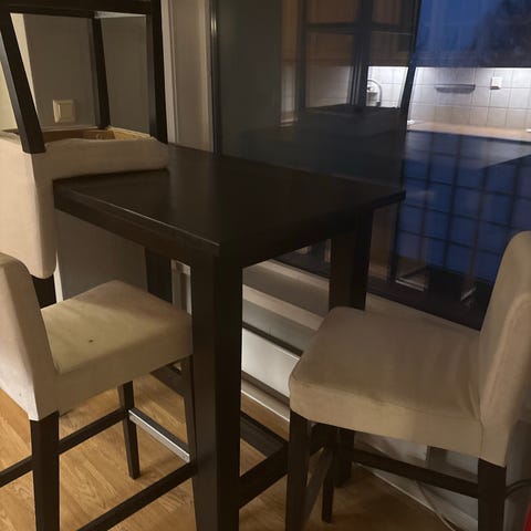 Selger barbord med 2 stk barstoler. Selges samlet for oppgitt pris. Om kun ønsker bord eller kun ønsker stoler, er pris 700 kr for bord. 200 kr per stol.