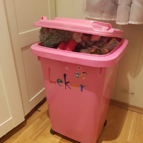 LEGO oppbevaringsboks i blå farge. Boksen har form som en stor LEGO-kloss med åtte knotter på toppen. Egnet for oppbevaring av småting og leker.