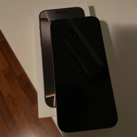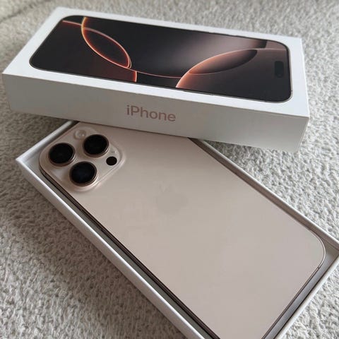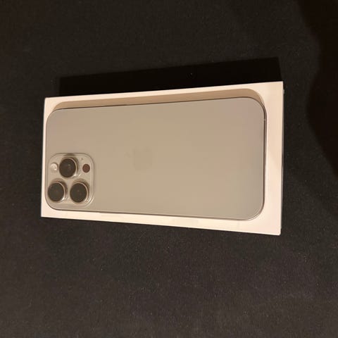 Selger en iPhone 16 Pro Max med 1 TB lagring i fargen Hvit Titan.