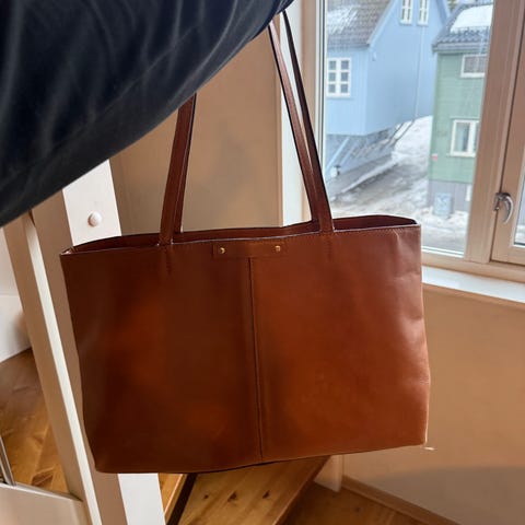 Praktisk veske med to store rom inni veska + en liten med glidelås og en på utsiden. Høyde 23 cm og bredde 23