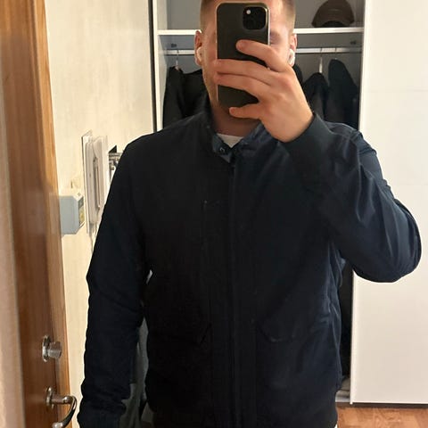 J. Lindeberg Jakke i blå farge, laget av bomull. Jakken er i størrelse L og har vannavstøtende egenskaper, egnet for kaldt og vått vær.