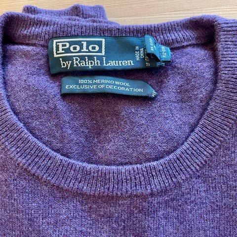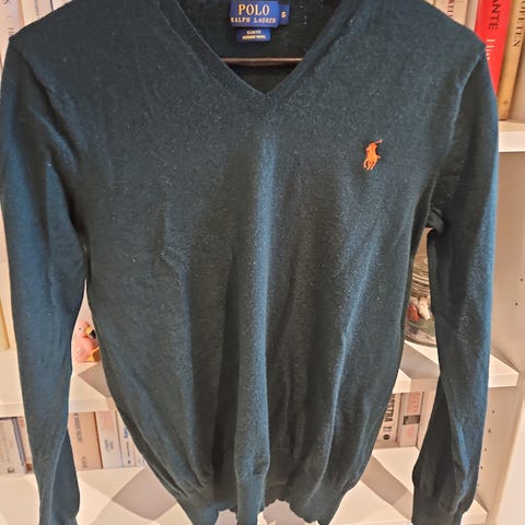 Ralph Lauren Polo ullgenser i størrelse S. Genseren er grå og laget av ullmateriale. Den har en halv glidelås i front og kabelstrikket mønster. Passer for menn.