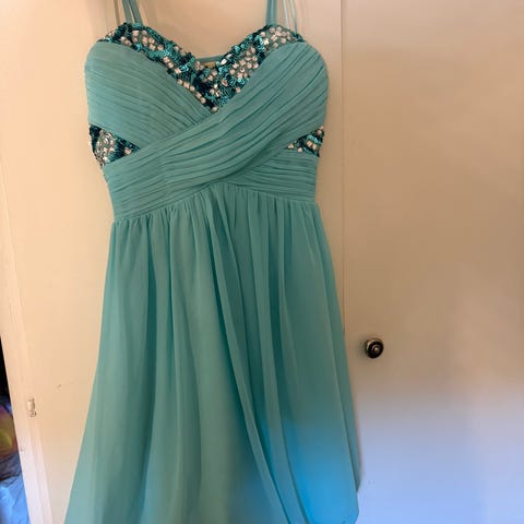 Floyd kjole til spesiell anledning i størrelse XL, farge lyse blå, laget av chiffon. Ble kjøpt i anledning skoleball, men selges da den aldri ble brukt. Følger også med sjal i samme farge som kjolen.