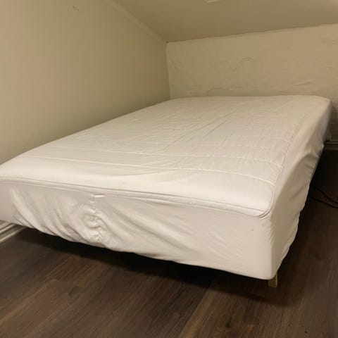 IKEA seng med tilhørende madrass og overmadrass. Sengen har en beige farge og er laget med treverk i rammen. Madrassen er hvit og tilpasset sengen. Produktet inkluderer også ben til sengen. Følger også med en sengegavl og skruer. Kjøper må hente.
