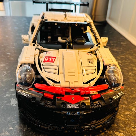 LEGO Porsche 911 RSR bilmodell i hvit med detaljer i svart og rødt. Modellen er laget i plast og representerer en sportsbil med åpning av dører og panser. Passer for samlere og som leketøy. Har ikke eske eller instruksjonsbok.