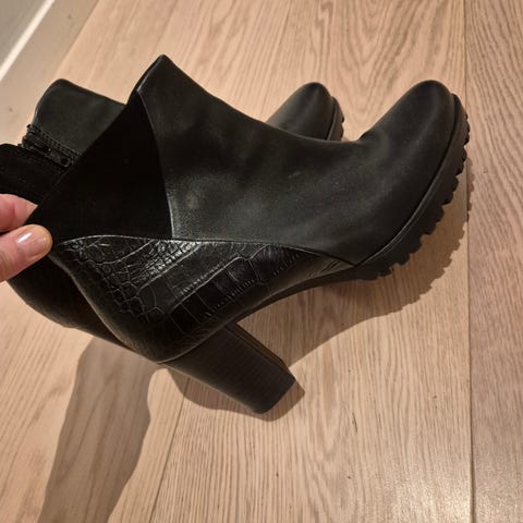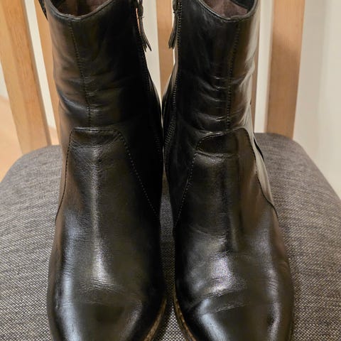 Støvler i svart skinn, størrelse 40. Støvlene har dekorative detaljer bak og spenne med kjede på siden. Nydelig foret med sort mykt skinnn
