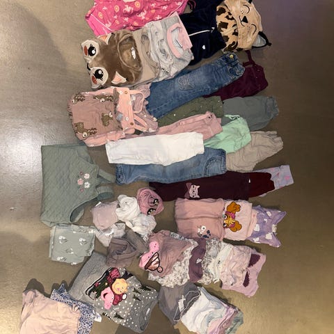 Stor klespakke til jente str 92. Se bilder for oversikt av plaggene. Noen klær er godt bruke og har slitasje/flekker, men mye bruk igjen. Perfekt til barnehagebruk. Noen plagg er lite/ ikke brukt. Vinterdress har to hull som trolig kan lappes (se bilder).