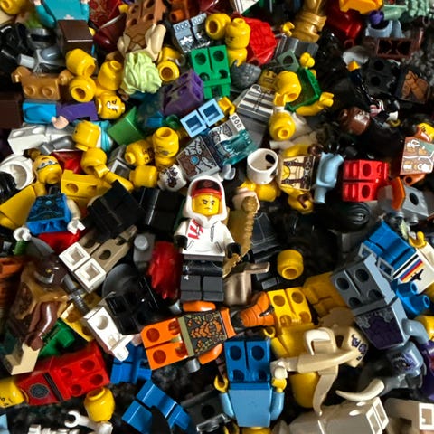 LEGO Minifigures består av ulike deler og figurer i flere poser. Inneholder hoder, kropper, hatter, tilbehør og andre komponenter i forskjellige farger og former.