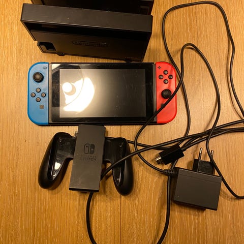 Nintendo Switch spillkonsoll med tilbehør inkludert Joy-Con-kontrollere i rød og blå farge, håndleddsstropper, lader, Joy-Con Grip og bæreveske. Konsollen er bærbar og har en skjerm som kan brukes til håndholdt spilling. Bærevesken er svart med Nintendo Switch-logo og har plass til konsollen og tilbehør. I tillegg er det minnebrikke fra Nintendo på 256 Mb.