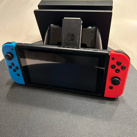 Nintendo Switch versjon 2 fra 2019 med forbedret batteritid. spillkonsoll med tilbehør inkludert Joy-Con-kontrollere i rød og blå farge, håndleddsstropper, lader, Joy-Con Grip og bæreveske. Konsollen er bærbar og har en skjerm som kan brukes til håndholdt spilling. Bærevesken er svart med Nintendo Switch-logo og har plass til konsollen og tilbehør. I tillegg er det minnebrikke fra Nintendo på 256 Mb.