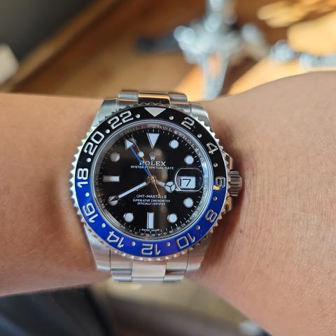 BATMAN Rolex GMT-Master II herreklokke med stållenke og svart/blå urskive. Klokken leveres i original eske med tag og alt av dokumentasjon.