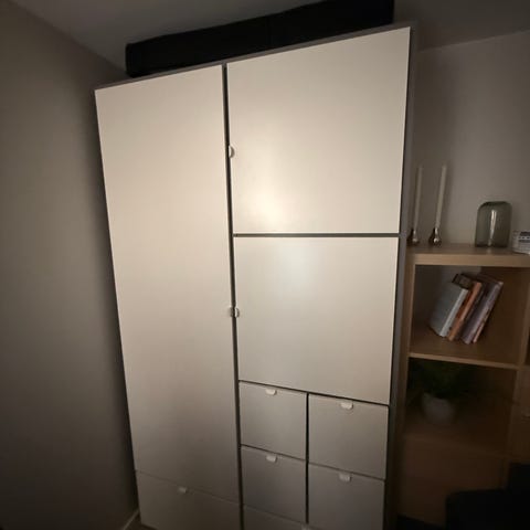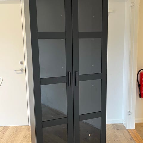 IKEA vitrineskap med glasshyller og integrert belysning. Skapet har to seksjoner med glassdører som gir god oversikt over innholdet. Nederste del av skapet består av fire romslige skuffer. Øverste del har høyglans hvite dører. Skapet står på hvite metallbein.