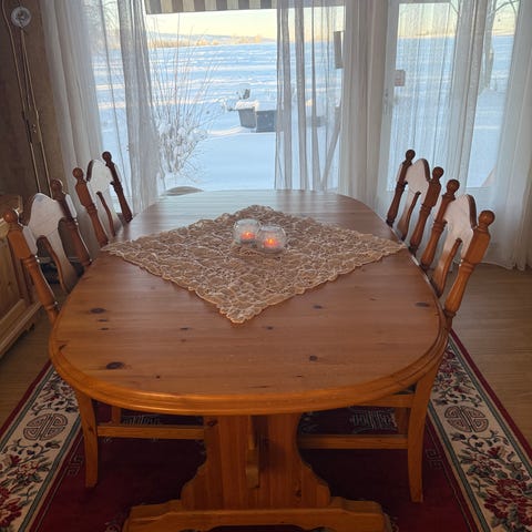 Pent brukt. Nylig kjøpt på Finn, men passet dessverre ikke inn. Veldig pen spisegruppe med fire stoler som nylig har fått nytt trekk.
