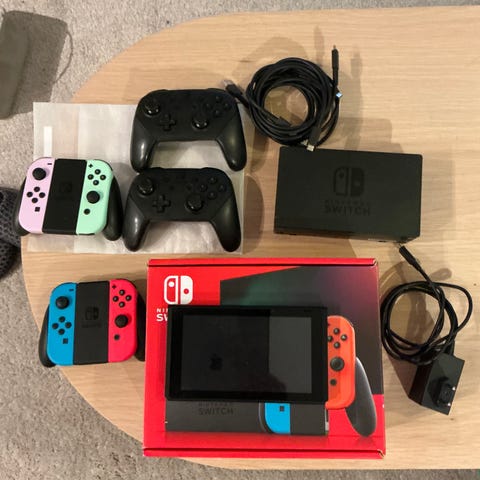 Nintendo Switch konsoll med håndholdt skjerm, kompatibel med Nintendo Switch-spill og tilbehør. Det på bildet er alt som følger med