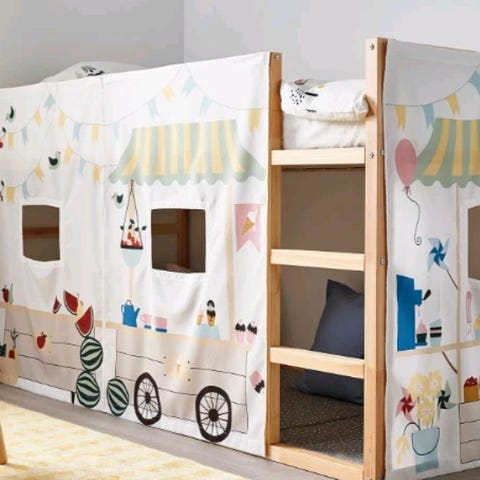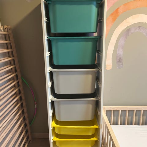 IKEA trappestige med oppbevaringsbokser i rosa plast og hvit ramme. Består av tre trinn med tilhørende oppbevaringsbokser som kan brukes til organisering og lagring. Passer til barnerom eller andre rom hvor oppbevaring og enkel tilgang er ønsket.