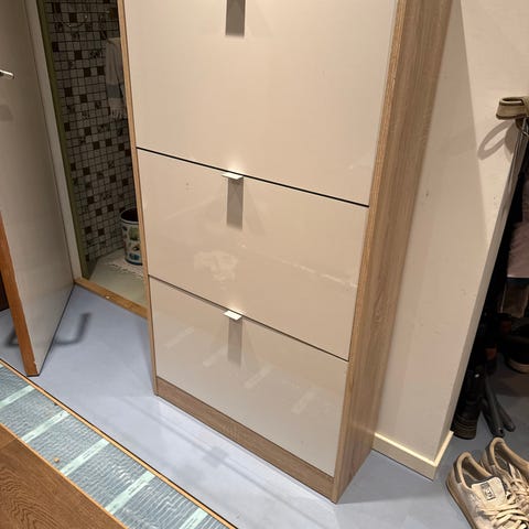 Pent brukt skoskap i praktisk størrelse med fire skuffer selges billig pga. flytting