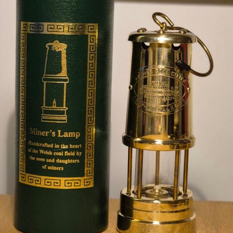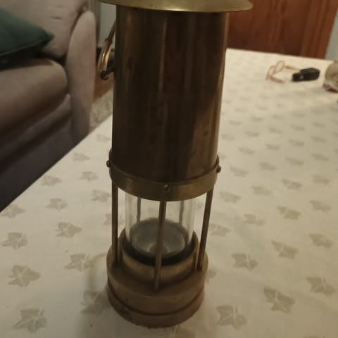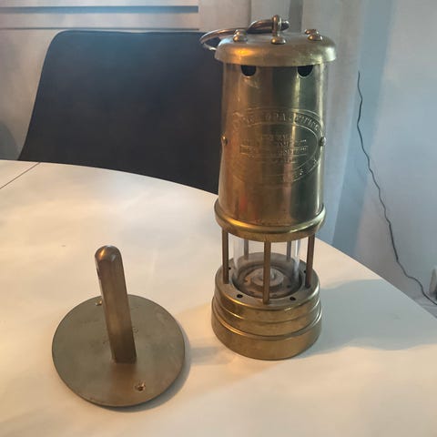 Vintage British Coal Mining gruvelampe laget i messing. Lampen har et sylinderformet design et håndtak på toppen.