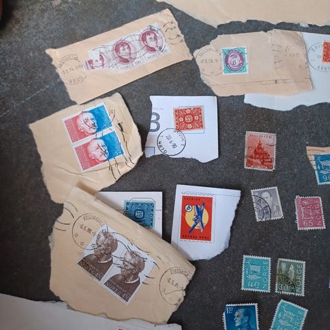 Frimerkesamling med diverse norske frimerker i ulike valører og motiver. Frimerkene er sortert på ark og inkluderer både eldre og nyere utgaver. Samlingen inneholder flere eksemplarer av enkelte frimerker, samt noen med påtrykte påskrifter og stempler. Det var en hobby for noen år tilbake , det er garantert noen»skatter der for deg som er interessert. Følger med noen konvolutter med usorterte merker og det er bla air mail fra usa og noen av stemplene på div merker er perfekte. Det er også post friske merker i samlingen.