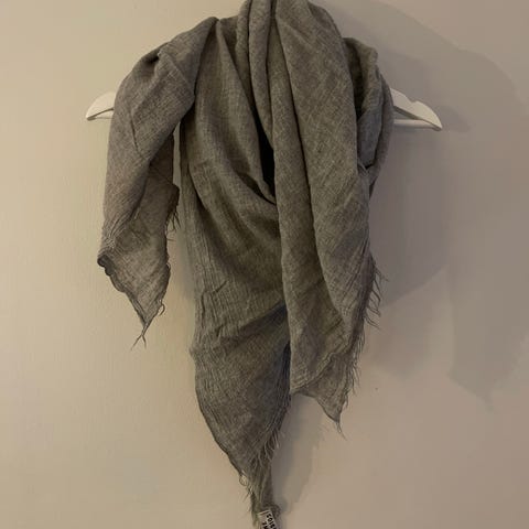 Skjerf i grå farge. Usikker på stoffet da lappen er borte, men den føles som ull, men kan godt være akryl. Ligner på Acne Studios sin. Størrelse 80 cm x 192 cm.