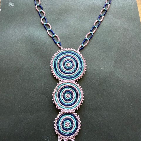 Unik Afrikansk lang halssmykke kjede av leire materiale "perler" lys brun og sort, med rød og hvit glass perler mellom. Meget pent og lite brukt, er som ny ingen skader. Lengde ca 58 cm dvs 116 cm rundt, og lagt dobbelt ca 27-28 cm lengde. Se bilder for nærmere beskrivelse. Kan hentes etter avtale Nydalen i Oslo, Vipps oppgjør eller sendes Fiksferdig i posten