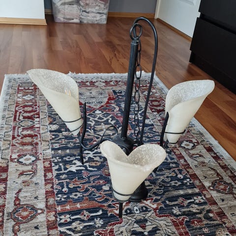 Flott åttekantet kuppel i gyllent glass som dessverre manglet oppheng…Nytt oppheng er laget av hullbånd i metall trukket med svart krympestrømpe og nye skruer. Ny ledning med svartmalt tak-kopp i metall og opphengsbøyle, lengde ca 50 cm. Kuppelen er 22 cm i diameter, ca 10 cm høy på sidene opp til kanten, et lite skår i et hjørne som vist. Selges uten lyspære (E14 sokkel). Nydelig med lys i 🤩