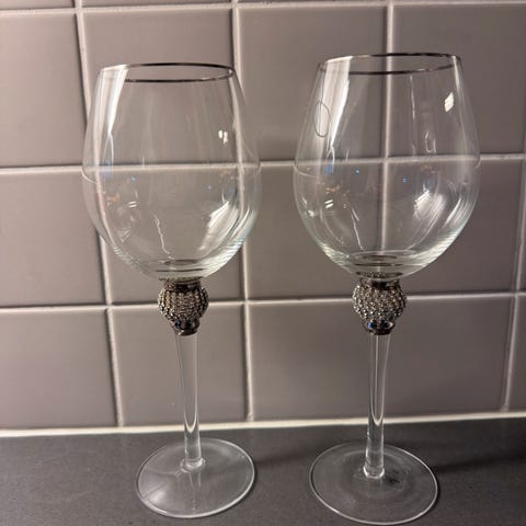 Selger et pent sett med håndlagde glass fra Perfect Home Collection. Glassene har dekorativ sølvfarget metallfot og passer perfekt til fest og servering. Pent brukt.