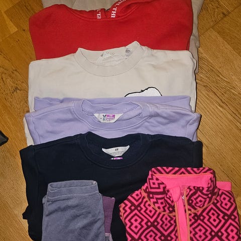 Flere plagg i forskjellige farger og mønstre, inkludert flerfarget design. Passer for barn i angitt størrelse.