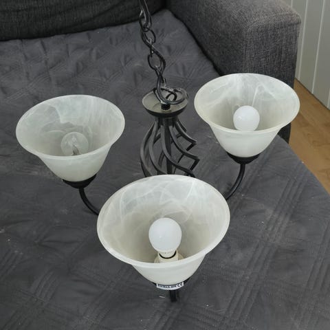 Taklampe i kromfarge med 7 kuler som lyser. Det følger med 4 pærer som virker.