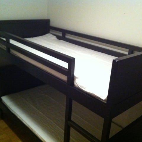 IKEA køyeseng laget i hvitt tre. Sengen har to nivåer med plass til madrasser, og inkluderer en stige for tilgang til øverste nivå. Det er også innebygde hyller under øverste sengnivå for oppbevaring eller organisering. Passer til barnerom eller rom med behov for plassbesparende løsninger.