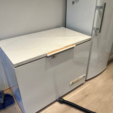 Electrolux fryseboks, 260L, med hvit farge og metallisk innvendig rom. Kjøpt i 2013. Fungerer godt, ingen lukt.