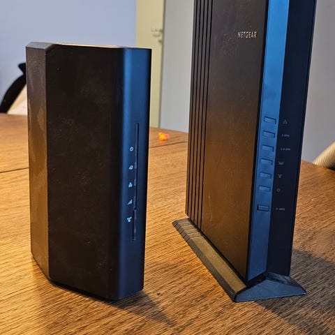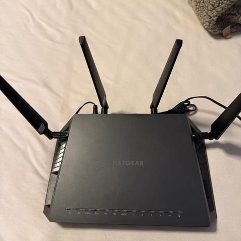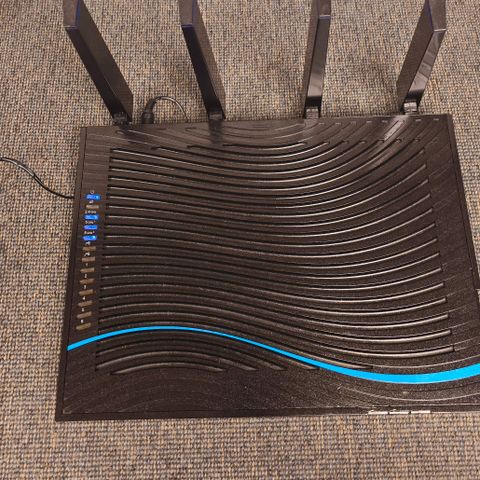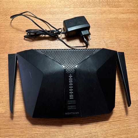 Netgear Nighthawk AX6000 Router med 12-stream WiFi, støtter 5 GHz og 2,4 GHz frekvensbånd. Passer for opptil 30 enheter samtidig. Leveres med strømadapter.