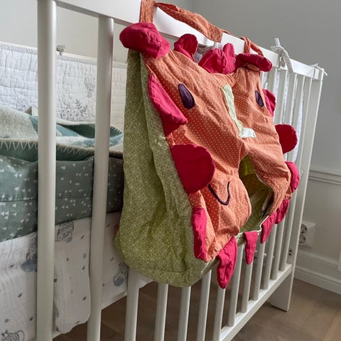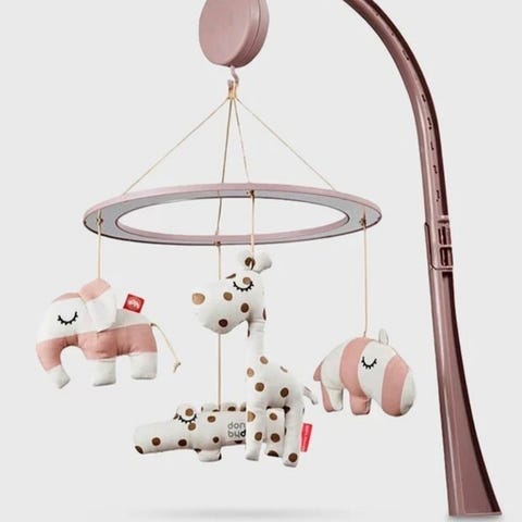 Done by Deer Musikkuro med speil i rosa farge. Uro har hengende myke figurer og er designet for å underholde og berolige spedbarn.