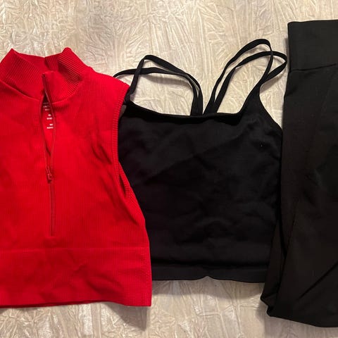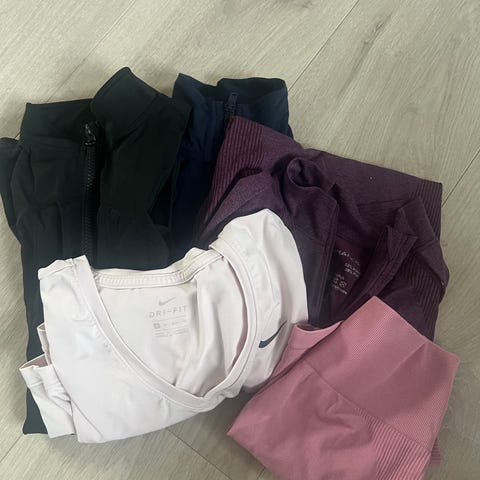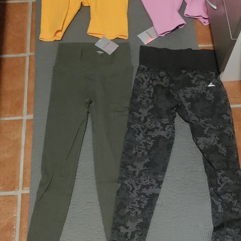 Selges samlet. Toppen og den grå tightsen er str M, de to andre tightsene er str S.