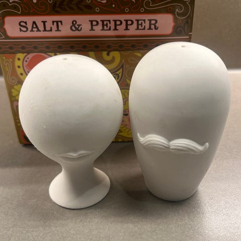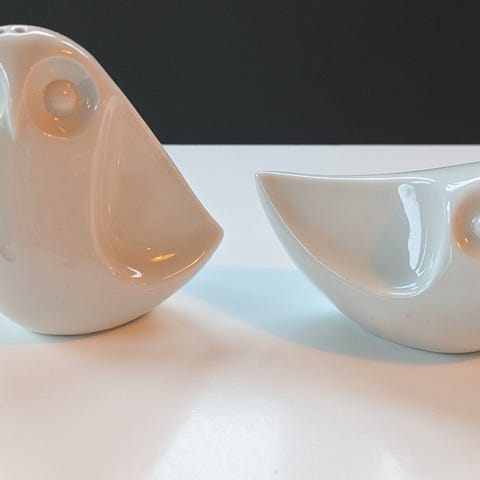 Salt- og pepperbøsse i porselen av typen Mr. & Mrs. Muse S&P fra JONATHAN ADLER selges.